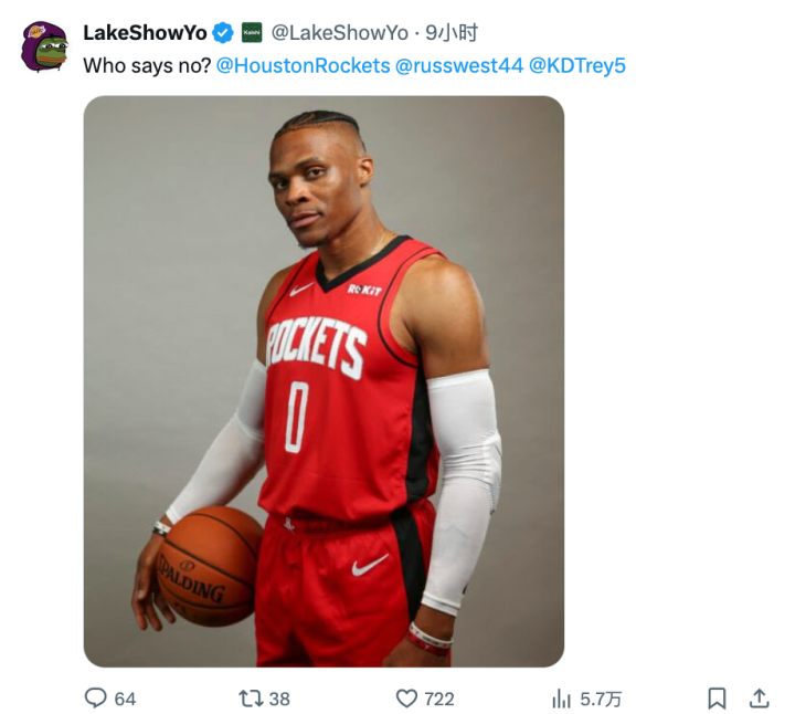 LakeShowYo更新X,晒出一张威少火箭时期的定妆照与球迷分享,并艾特了火箭队、威少、杜兰特,写道:“谁反对?”