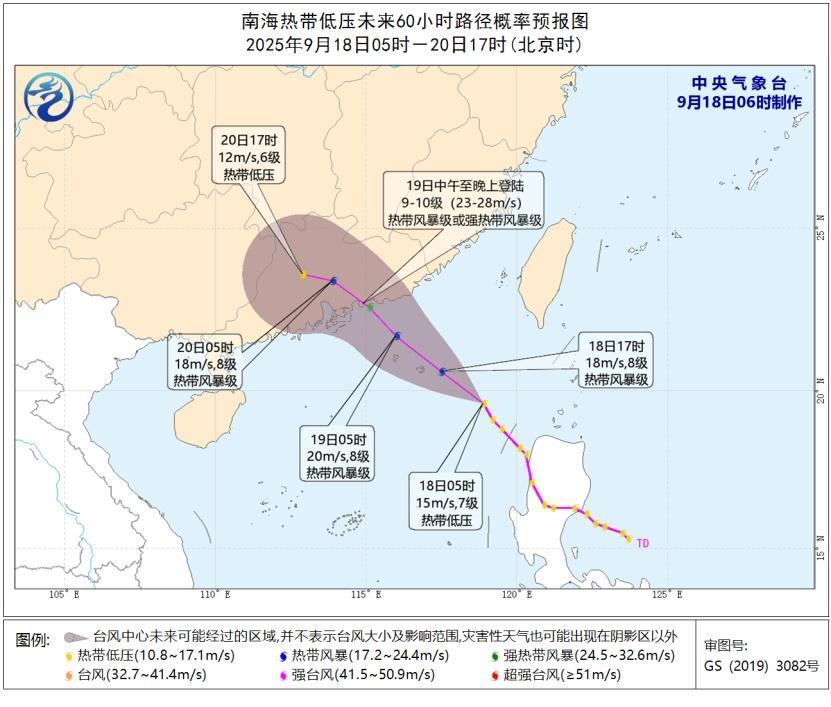 中央气象台9月18日6时对南海热带低压的路径和强度预报
